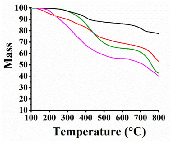 TGA graphs for MoSe2-CoP (pink), MoSe2 (black), f-MoSe2 (green), and CoP (red).