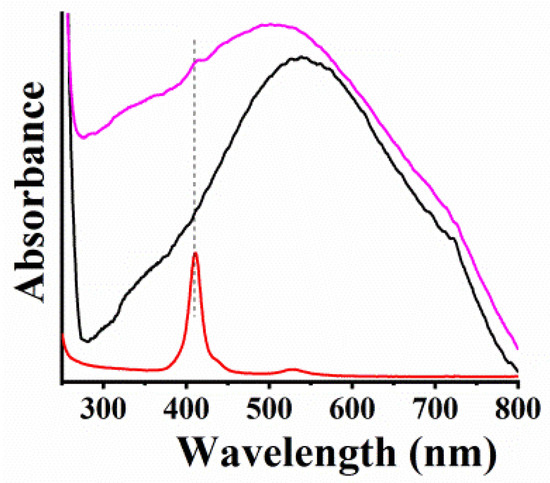 UV-Vis spectra for MoSe2-CoP (pink), MoSe2 (black), and CoP (red), in dichloromethane.