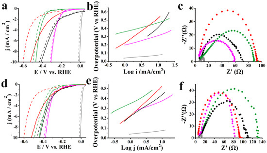 (a) LSVs for HER obtained at 1600 rpm rotation speed and 5 mV/s scan rate before (solid lines) and after 10,000 cycles (dashed lines) in aqueous 0.5 Μ H2SO4, (b) Tafel slopes, and (c) Nyquist plots for MoSe2-CoP (pink), MoSe2 (black), f-MoSe2 (green), CoP (red) and Pt/C (grey). (d) LSVs for HER obtained at 1600 rpm rotation speed and 5 mV/s scan rate before (solid lines) and after 10,000 cycles (dashed lines) in 0.5 Μ H2SO4, (e) Tafel slopes, and (f) Nyquist plots for WSe2-CoP (pink), WSe2 (black), f-WSe2 (green), CoP (red) and Pt/C (grey).