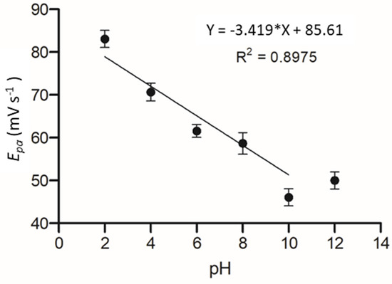 The effect of pH on the electrochemical system was determined as it has been shown in previous works that pH can significantly alter the affinity of an enzyme to its substrate. The C-MWCNT/DAO/EDC-NHS/GA SPE was measured against a pH range of 2–12 and cyclic voltammetric profiles of cadaverine were assessed as a function of pH by plotting the oxidation peak of cadaverine vs. pH. It should be noted that the pKa of cadaverine is 10.25 at 25 °C (Figure 8). A linear correlation was demonstrated between the increasing pH and the peak potential of cadaverine. The linearity of the system past the pKa of cadaverine ceased, causing a shift in Ep towards higher values. The performance of the enzyme was strongly dependent on pH of the buffer solution, showing an increase in peak potential with an increase in pH.