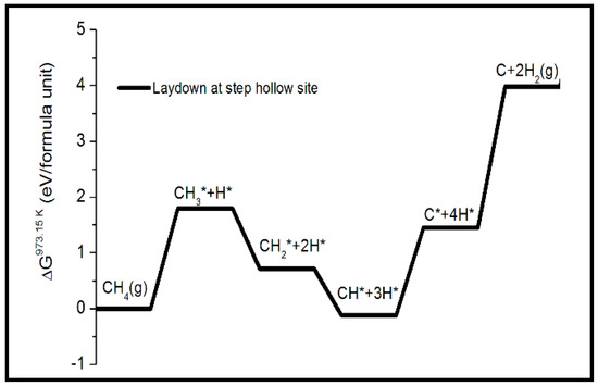Figure 1 shows the thermodynamic reaction profile for the laydown of a single carbon on Ni(322) surface at 973.15 K from the decomposition of methane. This shows that the first intermediate step that involves the stripping reaction for the removal of the surface hydrogen species from the methane to form the surface radical species (H*) is unfavorable, relative to the second and third intermediate reaction steps. By contrast, the fourth intermediate step of the hydrogen stripping reaction for the formation of four radical H* species on the surface is energetically less favorable than the previous (i.e., third step) by over 1.5 eV per formula unit (f.u.). The eventual reaction for the desorption of molecular H2 species and the laydown of the first carbon adatom on the SH site is over 2 eV/f.u. more unfavorable than the previous intermediate step. This endothermic reaction has an enthalpy change ΔH of 75 kJ/mol at 298 K [28].