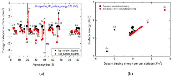 Figure 4 shows the effect of introducing a single-atom dopant on the Ni(111) surface energy and the dopants effects on the correlation between the surface energy and the dopant-binding energy per unit area in the absence of the carbon adsorbate. A dopant is introduced into the top- or sub-surface. The disruptive changes in free energy are calculated relative to the free energy of the undoped surface. The dopant-induced variations in the surface energy suggest that the introduction of a dopant species influences the surface sensitivity by altering the surface energy—even before an adatom of carbon is adsorbed. The thermodynamic free energy of the pristine Ni(111) surface is 2.62 Jm−2. This surface energy is consistent with results of another related DFT calculation [30]. Crucially, Figure 4a shows that the position of the introduced dopant and its chemical identity have non-trivial influences on the surface free energy.