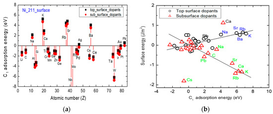 Disruptive effects of single-atom dopants on the free energy of the Ni(211) surface for top-surface (black squares) and sub-surface (red spheres) doping relative to the undoped surface. This figure shows the variation in the C1 adsorption energy with the atomic number of the dopant (a) and the correlation between the dopant-induced change in the Ni(211) surface energy and the C1 adsorption energy (b).