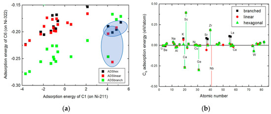 The correlation between the adsorption energies of C6 fragments of hexagonal, linear, and branched geometries and the single adatom (C1) species (a). Influence of surface dopants on the adsorption energy of polymerized C6 cluster (b).
