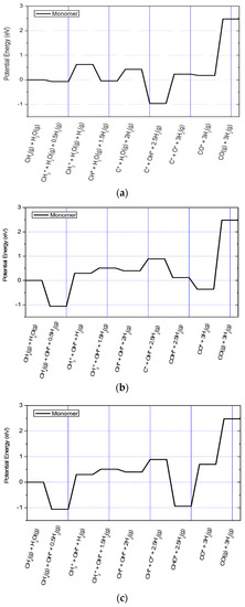 Firstly, in the CO* route, surface carbon species C* forms. The surface OH* only forms from the steam after the laydown of the monomeric C* species on the surface. It is the surface C* species that reacts with the OH* species and molecular hydrogen to yield the carbon monoxide in the gas phase, according to Figure 9a. Secondly, in the COH* route (see Figure 9b), the surface OH* species form from steams first before the methane dehydrogenation reaction for the monomeric carbon laydown completes CH4 (g) → C* + 4H*. Thirdly, the methane decomposition reaction is incomplete in the CHO* route (see Figure 9c). Hence, there is no laydown of the monomeric C* species. This is because methane dehydrogenation stops at the formation of the surface CH*. It is the CH* that reacts with the surface O* and OH* species, leading to the formation of CHO* on the surface. The combined methane steam reforming reaction of each route has a change in the total energy of ~2.5 eV, indicating the endothermic nature of the process.