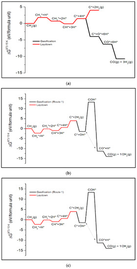 Figure 9 shows the effect of including entropic contributions to the thermodynamic free energy at 973.15 K. Although the effect of steam has not been included in the analysis of the methane cracking reaction for the monomeric carbon laydown, it is observed that the free energy profiles in Figure 9a–c show that the reaction is exothermic and proceeds spontaneously at high temperature. Although the intermediate step for the COH* formation (see Figure 9b) has a high thermodynamic barrier, all the subsequent intermediate steps are energetically favorable. In this case, the increased temperature of the simulated reaction makes the methane steam reforming reaction become overwhelmingly favorable thermodynamically.