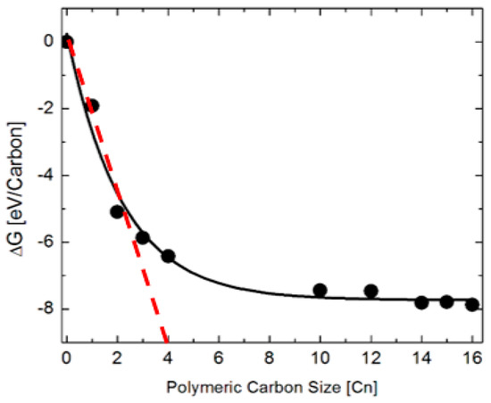 Figure 10 shows the change in free energy of the water dissociation reaction at 973.15 K for a variable size of the polymeric carbon. The exponential decay profile of the Gibbs free energy change during the carbon polymerization reaction has two distinguishable trendlines. In this case, the first region shows a rapidly decreasing ΔG as the cluster size Cn increases from 1 up to 4. A linear fit trendline is provided for the fluctuations in the ΔG as Cn changes within the first region, and the critical size of the carbon cluster increases, which is necessary for the spontaneous dissociation of steam during methane steam reforming in C4. In the second region, by contrast, the change in free energy is insensitive to the size of the carbon cluster. Figure 10 shows a nearly constant ΔG of ~−8 eV/carbon in the limit of large carbon clusters, where the size is Cn → C16.