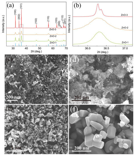 (a) XRD pattern of these ZnO powders; (b) normalized XRD result in the range of 35.5°–37.3°. SEM images of three kinds of ZnO powders: (c) ZnO-1; (d) ZnO-2; (e,f) ZnO-3.
