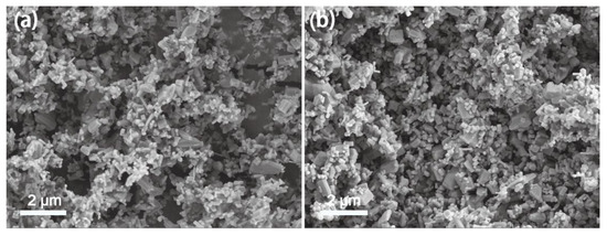 The morphologies of these ZnO powders were investigated by Scanning Electron Microscopy (SEM, Zeiss GeminiSEM 500). As shown in Figure 1c,d, both ZnO-1 and ZnO-2 are agglomerates formed by numerous spherical nanoparticles with an average size of about 20 nm, where ZnO-2 presents an irregular flake shape (Figure 1d). For ZnO-3, the particles exhibit a regular prismatic bulk with smooth surfaces, diameter ranging from 50 nm to 150 nm, and are independently dispersed without any adhesion (Figure 1e,f), indicating a better crystallinity of ZnO-3, which is consistent with XRD results.