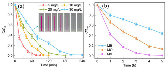 Environmental pollution and destruction, as well as the shortage of energy, are the most serious issues we are facing on a global scale [1,2,3,4]. For example, the release of textile waste in water resources poses a serious threat to human health and aquatic life [5,6,7]. Traditional adsorption, biological, and chemical methods still have limitations and shortcomings for dye degradation [8,9,10,11,12,13]. Therefore, technologies which are environmentally friendly, have low energy consumption, and are powered by renewable energy are highly desirable to eliminate dye pollutants.