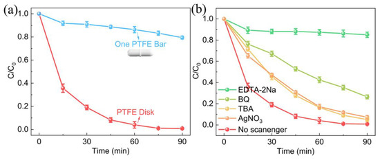 Comparison for tribocatalytic performance of ZnO-3: (a) With different shapes of PTFE-sealed magnetic rotating disk, (b) with the addition of various scavengers.