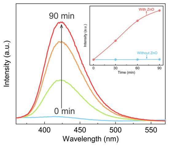 Fluorescence spectrum of 2-hydroxytereohthalic acid for ·OH detection under stirring for 90 min (Inset: The max intensity of 2-hydroxytereohthalic acid at 425 nm).