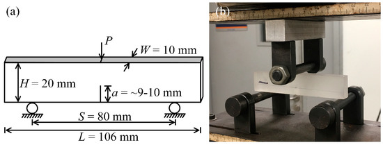 where S, P, W, H, and a are the span, fracture initiation load, width, height, and the pre-crack length of the specimen (Figure 2a), respectively.