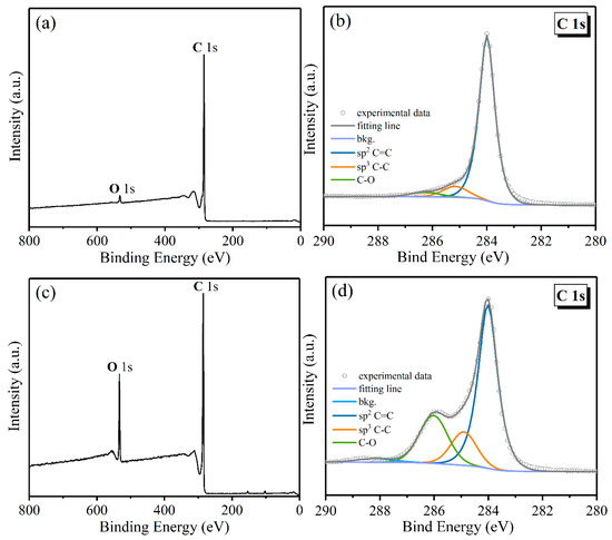 XPS scans for (a) GNPs and (b) CNT@X+GNPs fillers and (c,d) their high-resolution scan spectra of C 1s peaks.