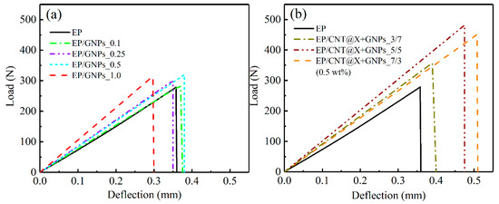 Load-deflection curves of the (a) EP/GNPs and (b) EP/CNT@X+GNPs nanocomposite specimens under the quasi-static 3P-ENB loading condition.