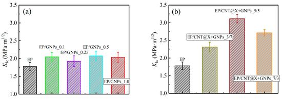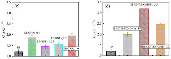 Quasi-static 3P-ENB fracture parameters: (a,b) mode-I critical-stress-intensity factor (KIc) and (c,d) fracture energy density (GIc) of the EP/GNPs and EP/CNT@X+GNPs nanocomposite specimens.
