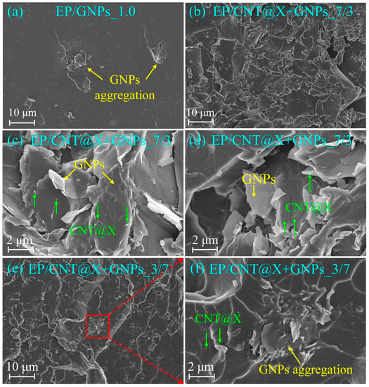 To identify the microstructural features and toughness mechanisms of hybrid/single-phase particles within the neat matrix, the fracture surfaces were examined with a FE-SEM instrument, as shown in Figure 8. For the EP/GNPs_1.0 specimen (Figure 8a), the overall fractographic surface was flat and smooth, indicating a weak crack growth resistance [40]. Meanwhile, there were several graphene aggregations to be captured across the observation window. The slender lacerated tails suggested that the graphene aggregations as a crack generator not brake were inefficient to stop the crack growth within the nanocomposite, resulting in the decreased deflection (Figure 6a). On the other hand, the fracture surface of the hybrid nanocomposite exhibited more complex features (Figure 8b–f), and lots of different heights and levels of fragmented fracture surfaces were generated, representing higher crack growth resistance and more fracture energy consumption. In particular, no obvious aggregations were found within the EP/CNT@X+GNPs_7/3 specimen. The fine dispersion of carbon fillers allowed for the uniform deformation for the epoxy matrix and raised the reinforcement efficiency. The FE-SEM images at higher magnification revealed more details about the synergistic effect between CNT@X and GNPs. Figure 8c,d show that several CNT@X particles were attached to the GNPs surface. In other words, the modified CNT@X with excellent dispersity had a chance to be inserted into inter-layers of GNPs and prevent the stacked phenomena, synergistically improving the dispersibility of CNT@X and GNPs. Accordingly, loosely-packed 3-D particulate networks were formed in the neat epoxy to effectively reinforce its fracture toughness, as shown in Figure 9. As mentioned before, if the mass ratio between CNT@X and GNPs was adjusted from 7/3 to 3/7, the fracture characteristics of the EP/CNT@X+GNPs_3/7 specimen degraded conveniently. Figure 8e,f answer this rollback and exhibited several obvious aggregations across the overall fracture surface. It is believed that, within the EP/CNT@X+GNPs_3/7 specimen, the quantity of CNT@X was not enough to interact with more GNPs to construct an integrated CNT@X+GNPs system. The additional GNPs would reaggregate to harm the fracture properties of the EP/CNT@X+GNPs_3/7 specimen. This is also the intrinsic reason why the EP/CNT@X+GNPs_3/7 specimen possessed the most outstanding performance among all nanocomposite specimens.