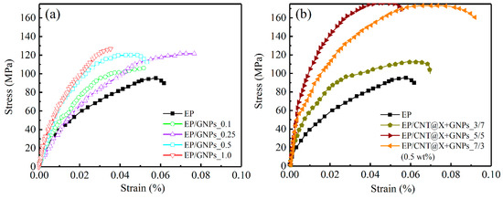 Dynamic compressive stress–strain curves of the (a) EP/GNPs and (b) EP/CNT@X+GNPs nanocomposite specimens under a strain rate of 1000/s.