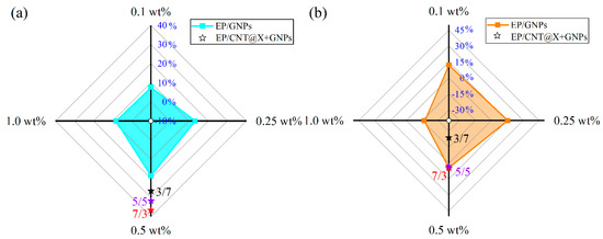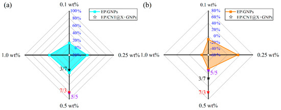 Radar plot for improved (a) dynamic compressive strength and (b) failure strain with respect to neat epoxy for different nanocomposite systems under a strain rate of 500/s.