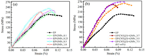 Dynamic compressive stress–strain curves of the (a) EP/GNPs and (b) EP/CNT@X+GNPs nanocomposite specimens under a strain rate of 500/s.
