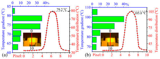 Surface temperature analysis for (a) EP/GNPs_1.0 and (b) EP/CNT@X+GNPs_5/5 specimens under an applied voltage of 70 V, including the line temperature distribution (dash-dotted line) along the pixel length: 0 → 10 and the statistical distribution (histogram) of surface temperature between two electrodes.