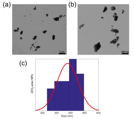 The morphology of ZrO2-acac NPs was investigated using an FEI Tecnai 12 transmission electron microscope (FEI Company; Hillsboro, OR, USA). The NPs (0.1 mg mL−1 in water) were deposited on a standard copper grid (100 mesh) covered with a Formvar film. After 10 min, the drop was removed, and the grid was air-dried overnight at room temperature. The mean size of the ZrO2-acac NPs was estimated from the distribution of the Gaussian fit obtained by ImageJ software (rel. 1.53k, NIH, Bethesda, MD, USA).