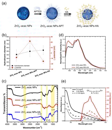 (a) Functionalization scheme. (b) DLS characterization of ZrO2-acac NPs, ZrO2-acac NPs-APT, and ZrO2-acac NPs-HA. (c) FTIR analysis of NPs after each functionalization step. (d) Photoluminescence spectra of the NPs before and after the functionalization with hyaluronic acid at the excitation wavelength of 325 nm. (e) Absorbance and relative photoluminescence of ZrO2-acac NPs-HA at different concentrations. Results are expressed as the mean ± s.d. (n ≥ 3).