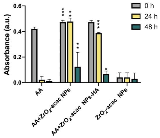 In a previous work [17], the ability of the hybrid ZrO2-acac to generate ROS was demonstrated by EPR analysis and attributed to partial electron transfer processes between acac and Zr due to the presence of O2 acting as a conduction band electron scavenger hindering the fast charge recombination. Before testing the effects of functionalized NPs in the OS cells, we performed a qualitative ascorbic acid assay to evaluate the residual oxidative potential (Figure 4). The assay was carried out with 0.1 mg mL−1 of ZrO2-acac NPs or ZrO2-acac NPs-HA dispersed in a solution of ascorbic acid (AA). Since the AA absorbance decreases upon oxidation by molecular oxygen, we measured the absorbance of AA at 266 nm to investigate whether the developed NPs played a role in the oxidation process of AA. The AA oxidation was delayed up to 48 h when the molecule was dispersed in the presence of both ZrO2-acac NPs and ZrO2-acac NPs-HA, thanks to the ability of the NPs to interact and subtract the molecular oxygen to the oxidation process. This result shows that ZrO2-acac NPs and ZrO2-acac NPs-HA are promising ROS-generating materials for the simultaneous treatment and imaging of OS cells.