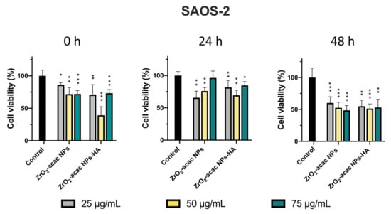 Cytotoxicity test performed with the Alamar Blue assay after 24, 48, and 72 h of incubation of SAOS-2 cells with ZrO2-acac NPs and ZrO2-acac NPs-HA at 25 (grey), 50 (yellow), and 75 (green) μg mL−1. The level of significance was set at probabilities of * p < 0.05, ** p < 0.01, and *** p < 0.001. The results are expressed as the mean ± s.d. (n ≥ 3). Non-significant data are not reported.