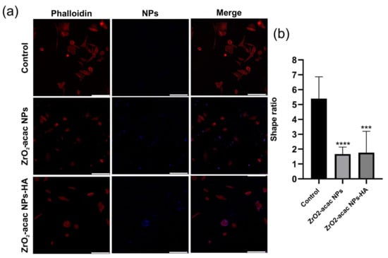 (a) Confocal analysis of SAOS-2 cells (red) incubated with ZrO2-acac NPs and ZrO2-acac NPs-HA (blue) for 48 h. Cell membranes were stained with red phalloidin. Both of the developed formulations interacted with cancer cells, altering their viability, as can be seen by changes in the SAOS-2 morphology and cell density. The scale bar is 250 µm. (b) Cell shape index calculated by the image analysis of the SAOS-2 cells incubated with ZrO2-acac NPs and ZrO2-acac NPs-HA. The images are representative of four experiments. The level of significance was set at probabilities of *** p ≤ 0.0002 and **** p ≤ 0.0001 vs. control.