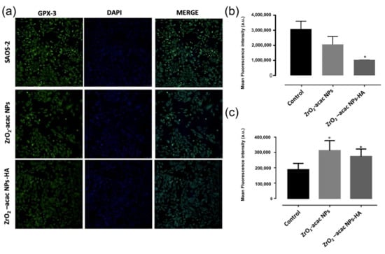 Based on this evidence, we suppose that the increased ROS levels induced by the developed NPs may decrease the expression of Gpx-3 enzymes in SAOS-2 cells and promote cell apoptosis. To investigate this mechanism, we incubated SAOS-2 cells with ZrO2-acac NPs and ZrO2-acac NPs-HA for 48 h at the concentration of 50 μg mL−1, which was shown to exert the highest cytotoxicity on the selected cell line. To investigate the expression levels of Gpx3, the cells were further incubated with a Gpx-3-polyclonal antibody conjugated with Alexa-Fluor®–488, and cell nuclei were stained with DAPI (Figure 7). Images obtained through confocal microscopy studies and supported by quantitative image analysis have shown a reduced cell fluorescence upon incubation with ZrO2-acac NPs and ZrO2-acac NPs-HA compared to untreated control cells (Figure 7a,b). These results suggest that both kinds of NPs decreased Gpx-3 expression in SAOS-2 cell through increased ROS levels, which downregulated the expression of antioxidative mechanisms, such as Gpx3. To confirm the activation of cell death mechanisms following higher ROS levels induced by ZrO2-acac NPs-HA in SAOS-2, p53 expression was investigated through immunofluorescence analysis. Indeed, as previously reported [42], the suppression of the p53 gene determines an uncontrolled proliferation of cancer cells. By contrast, the expression of p53 associated with increased ROS levels causes a stable cell growth arrest or programmed cell death (apoptosis) by encoding proteins with physiological and biological properties. Here, our results suggested that the cell treatment of Saos-2 cells with ZrO2-acac NPs and ZrO2-acac NPs-HA for 72 h induced p53 expression (oncosoppressor) compared to the control that does not express the p53 signal (red). The pictures reported in Figure S5 show, in detail, single and merged channels.
