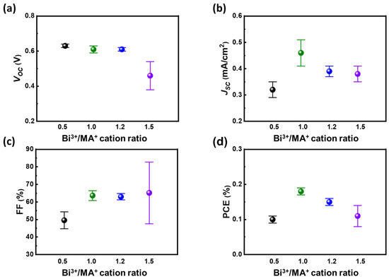 Relation between cation ratio, Bi3+/MA+ from 0.5 to 1.5, in methylammonium bismuth iodide and their photovoltaic performance: (a) VOC, (b) JSC, (c) FF, and (d) PCE.