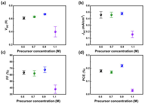 Optimization of MBI materials thickness from precursor concentration: (a) VOC, (b) JSC, (c) FF, and (d) PCE.