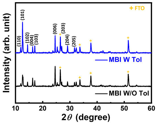 In addition to absorption, the crystallinity of MBI films is also essential for carrier transportation, especially in lead-free material. The minor d orbital coupling effect (spin-orbital coupling effect) in MBI materials, compared to lead-based perovskite materials, gives them a relatively short carrier lifetime [29]. As a result, constructed MBI materials with less defects are of a ladder to perform their intrinsic photovoltaic properties. From a macroscopic point of view, creating high crystallinity materials is speculated to have a minor defect that results in traps for carriers. Based on Figure 6, the characteristic peak of MBI films in XRD patterns indicates that the reactants of methyl ammonium iodide and bismuth iodide completely react and form MBI under both deposition conditions. Diffraction peaks at 26.5°, 33.7°, 37.7°, and 51.5° refer to the characteristic peaks of FTO substrates. Although both of them have no trail of reactants in films, their crystallinity are still different. The diffraction peaks from the toluene-treated MBI film are sharp compared to the peaks from MBI film without treatment. To evaluate the crystallinity of the films, Scherrer equation is used to calculate the averaged grain size of MBI films (Equation (1)).
