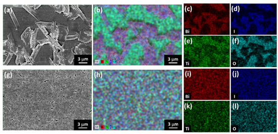 Morphology and element analysis of MBI films without or with anti-solvent of toluene treatment: (a) surface morphology of MBI without antisolvent, (b) the corresponding EDS, (c) bismuth mapping image, (d) iodine mapping image, (e) titanium mapping image, and (f) oxygen mapping image; (g) surface morphology of MBI with antisolvent treatment, (h) the corresponding EDS, (i) bismuth mapping image, (j) iodine mapping image, (k) titanium mapping image, and (l) oxygen mapping image.