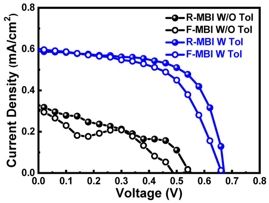 Taking advantage of film coverage and minor aggregation, the device with toluene-treated MBI shows high PV performance compared to the device without toluene treatment. The champion device can achieve a PCE of 0.26%, which enhances around 3.2 times, compared with the champion device without toluene treatment of 0.08%, as shown in Figure 8. The smooth J-V curve of the champion device with toluene-treated MBI film implies the constructed device can effectively extract the generated electron-hole pairs with the built-in potential in the device.