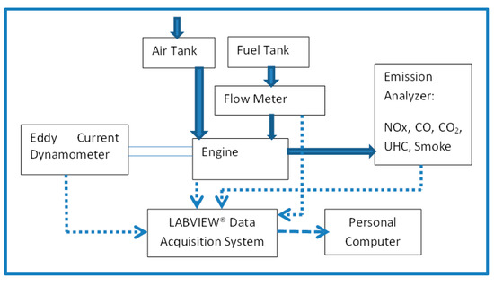 A naturally aspirated, 4-stroke, single cylinder, diesel research engine equipped with an eddy-current dynamometer is used. Figure 2 shows schematic of the experimental setup. Table 3 displays the relevant engine specifications. Horiba® emission analyzer modules were employed to measure the tailpipe emissions (HC, CO, CO2, and NOx). The test rig is integrated with the instrumentation for acquisition of load, temperatures, airflow, crank angle (CA), and combustion pressure. Data is acquired by the LabView® data acquisition (DAQ) system. A fixed ratio of diesel–biodiesel blend in the ratio 25:75 is chosen while varying the size of ceria NPs. The ceria NP concentration in our study is fixed at 90 ppm, which is the same as the optimized NP size from various earlier works, as reported by Hawi et al. [56]. The fuel blend details are shown in Table 4.