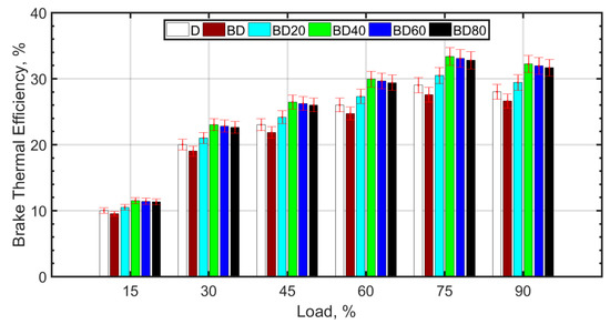 Figure 3 shows the brake thermal efficiency (BTE) with load for the fuel blends.