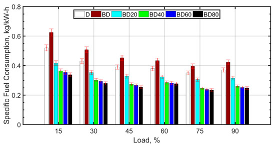 The BTE increases with load for all the fuel blends. This is expected since the cylinder temperature increases with load due to the higher mass of fuel injected, thereby causing higher cylinder temperatures. For loads greater than 75%, there is no significant change in BTE, because the fuel becomes richer, and there is a tradeoff between higher combustion temperature and combustion inefficiency. The BTE trend across the fuel blends is similar for all loads. The BTE is lower for BD compared to diesel (D). Some authors, such as Vairamuthu et al. [46], have attributed this to the lower calorific value [73], or density [74,75] of CIMEBD, whereas others speculate that the higher molecular oxygen content of the biodiesel may be the reason for the lower BTE [32]. However, for the same load, a higher mass of biodiesel injection is required as compared to diesel. The reason for the slightly reduced BTE in the case of BD is more likely due to the higher biodiesel viscosity [76,77] and surface tension, which cause relatively inferior atomization, delayed ignition, and relatively inefficient combustion [38]. Ceria NPs assist in better atomization due to lower ignition delay caused by micro-explosion, therefore, more efficient combustion and better BTE [51]. Biodiesel blends with ceria NPs perform better in terms of BTE compared to diesel. The optimum BTE values are obtained for BD40, that is, for biodiesel blended with 40 nm ceria NPs. It is observed from other studies that ceria NPs between 30 nm and 40 nm size are most desirable for the purpose of improving the BTE [38]. The NPs have high surface-to-volume ratio and assist in better atomization due to micro-explosion and micromixing [78]. However, smaller NPs tend to agglomerate, and this leads to higher fuel viscosity [79] and poor atomization. It is also known that agglomeration of NPs results in a wider NP size distribution and deterioration of the desirable NP properties. On the other hand, larger NPs are known to decrease the thermal conductivity of the nanofuel. It is also known that it is difficult to maintain the stability of large sized NPs in the base fuel. Therefore, the BTE increase for BD60 and BD80 is comparatively low. Figure 4 shows the brake specific fuel consumption (SFC) variation with load for the fuel blends.