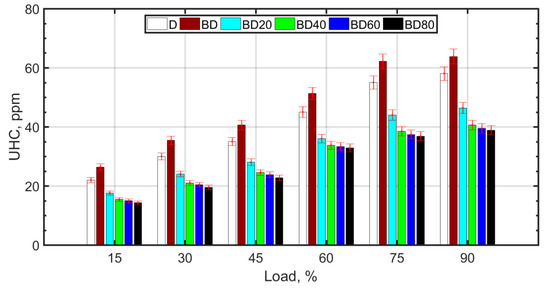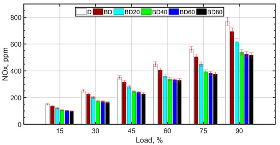 whereas lower temperatures and pressures favor the formation of CO as a result of poor combustion efficiency. The higher viscosity of BD and the resulting poor atomization causes retarded droplet evaporation. It is known that droplet evaporation time is directly proportional to the droplet diameter. This causes retarded ignition and inefficient combustion for BD. With the addition of NPs, combustion efficiency improves due to micro-explosion and the oxygen carried by the NP molecules. There is a slight decrease in CO2 and a corresponding increase in CO. For the fuel blends with NPs, there is complete combustion due to micro-explosion, and reduced ignition delay. However, the molecular oxygen donated by ceria NPs and also the molecular oxygen of the biodiesel results in an overall reduction in CO2 emissions. However, CO formation is slightly enhanced for the diesel–biodiesel blend (BD), as shown in Figure 7. CO formation is heightened at higher loads due to rich mixtures at loads greater than 75%.