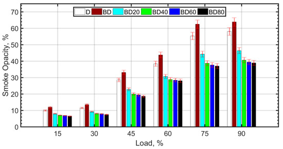 Smoke/soot trends are shown in Figure 9. Soot formation mechanism is different and more complex from the oxidation of carbon species such as CO and UHC. The reversal reaction as in the case of CO and CO2 is not applicable for soot. Soot formation requires the presence of soot precursors such as naphthalenes [82] and aromatics in the fuel. Since BD has higher aromatic content [26] compared to diesel, there is an increase in smoke opacity for BD, which, however, decreases with NP addition. Large NP size does not seem to have much effect on smoke opacity reduction compared to 40 nm NP size. The reasons may be due to reduced effectiveness of larger sized NP due to agglomeration, higher fuel viscosity, poor atomization, and lower temperatures that can inhibit the oxidation of large chain soot particles. In general, better combustion characteristics of fuels due to NPs are caused by good atomization, molecular oxygen, lower ignition delay, and related phenomenon [53].