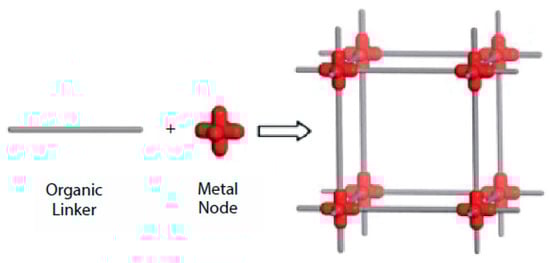 Recently, the use of advanced engineered materials for As removal has received much attention. Carbon nanotubes [,,], metal oxides [,], graphene oxide [,,,] and Metal-organic frameworks (MOFs) have been studied for this purpose. The surface area, and consequently the adsorption capacity, of engineered adsorbents can be modified by adding different organic and inorganic materials to their engineered structure. MOFs, as porous coordination polymers, are a class of advanced engineered materials that are synthesized by combining inorganic materials (metal ions) with organic ligands [,]. The unique properties of MOFs, such as their large specific area, tunable pore sizes and adjustable functional groups, have made them a superior class of adsorbents for water treatment applications, and particularly for heavy metal removal [,,,,]. MOFs, as advanced engineered adsorbents, are synthesized by combining inorganic materials (metal nodes) with organic linkers. A typical structure of MOFs is shown in Figure 1.