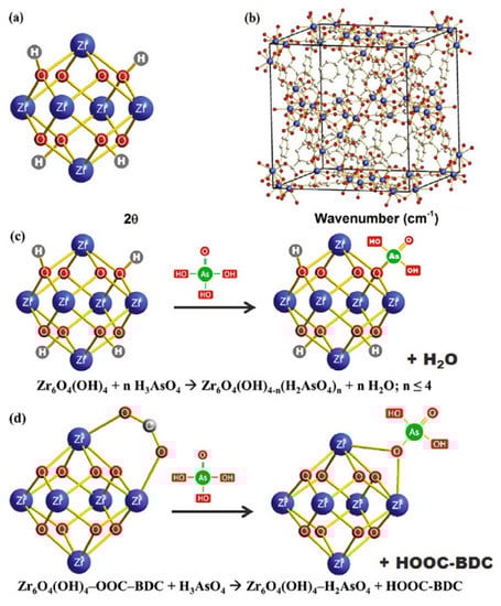 UiO-66 framework (a) with octahedral zirconium clusters (b), and method of adsorption of arsenate by either coordination at hydroxyl group sites (c) or by replacement of BDC ligands (d). (Reproduced with permission from Ref. [] from Elsevier, 2022).