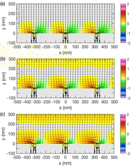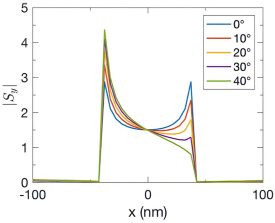 At normal incidence, the time-averaged Poynting vectors for incident energy flow were equidistant as they flowed along the propagation direction as indicated in Figure 1a. As the energy flowed into the slits, the funneling sizes near the slits were symmetrical and equal in magnitude. When the fields penetrated into the metal, the field distribution was also symmetrical and equal in magnitude. In contrast, at small incident angles 5° and 10° to the normal, the penetrated field distributions inside the metal became highly asymmetrical as shown in Figure 1b,c. The funneling size and the magnitude to the left of each slit was increased while the size to the right was decreased. This was more evident as the angle of incidence was increased. For both cases, the energy flow entered at an angle until y ≈ 200 nm; it was turned to downward only in the case of normal incidence until y ≈ 125 nm; and it was then returned back to its original angle of incidence again before funneling into the slits. We found this to be an interesting continuation of normal incidence; as observed in the second region, (200 nm > y > 125 nm) would be expected. For example, when the angle of the incident wave was 10°, the field had a minima Savg = 0 at y ≈ 162 nm and 487 nm and a maxima Savg ≈ 0.35 at y ≈ 0 nm, 325 nm, and 650 nm. The energy flows were bent from y = 325 nm to 162 nm, straight at y = 162 nm, and bent again from y = 162 nm to 0 nm.
