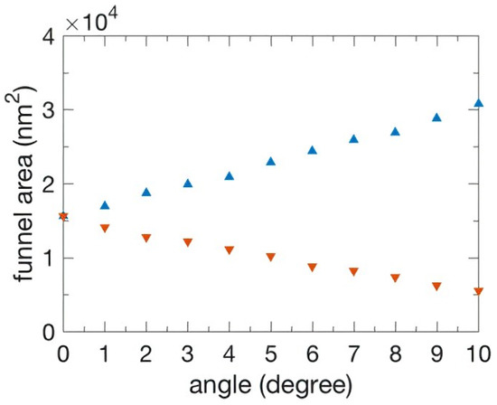 The relationship between funnel area and the angle of incidence. The left (right) funnel area is indicated by the blue upward-triangle (orange downward-triangle).