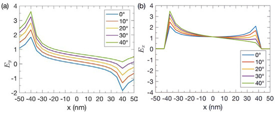 The asymmetrical funneling effect was further examined quantitatively by studying the horizontal electric field Ex near the slit entrance, as shown in Figure 3b. The Poynting vector for the y component Sy was proportional to −Ex × Hz. As the angle of incidence was increased, the amplitude of the horizontal electric field Ex in the left (right) corner of the central subwavelength slit was increased (decreased) as well. The surface charges at the left corners accumulated. The edges further enhanced the local electric field, the Poynting vectors, and the funneling. Regarding the edge effect at the left corner, the horizontal electric field Ex moved the charges on the surface to form the current towards the +x direction. The vertical electric field induced the current on the slit surface in the +y direction so that more positive charges accumulated to enhance the local electric field. At oblique incidence, the electric field at the right corner had a different phase, which should be considered for understanding the detailed mechanism.