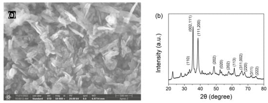 (a) SEM image of CuO nanoparticles; (b) XRD pattern of CuO nanoparticles.