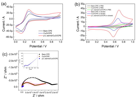(a) CV curves of potassium ferricyanide on bare CPE, CuO/CPE, and p-L-serine/CuO/CPE; (b) CV curves of PBS solution and olivetol on bare CPE, CuO/CPE, and p-L-serine/CuO/CPE; (c) Nyquist plots of bare CPE, CuO/CPE, and p-L-serine/CuO/CPE.