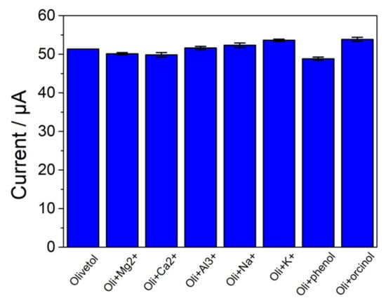 For the reproducibility test, five independently modified electrodes were used to determine the same sample and the resulting relative standard deviation (RSD) was 2.57%. The repeatability of the modified electrode was obtained by testing five times a day, and the obtained RSD was 2.42%. For the stability test, the modified electrode was stored in the laboratory at room temperature, and the signal only decreased by 3.00% of its initial value over a week. The interference study of the modified electrode was studied in the presence of interferents. The concentrations of inorganic ions and organic compounds were 10-fold higher than that of the target compound, and the concentration of orcinol was the same as that of the target compound. It was found that the addition of Mg2+, Ca2+, Al3+, Na+, K+, phenol and orcinol influenced the signal in bearable degrees in the determination of olivetol (Figure 7). The relative errors during the test were kept at less than 5.0%, indicating that these compounds were not potential interferences for this analysis [36].