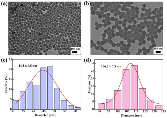 TEM images of G50PS (a) and R100PS (b) and the corresponding particle size statistics of G50PS (c) and R100PS (d).